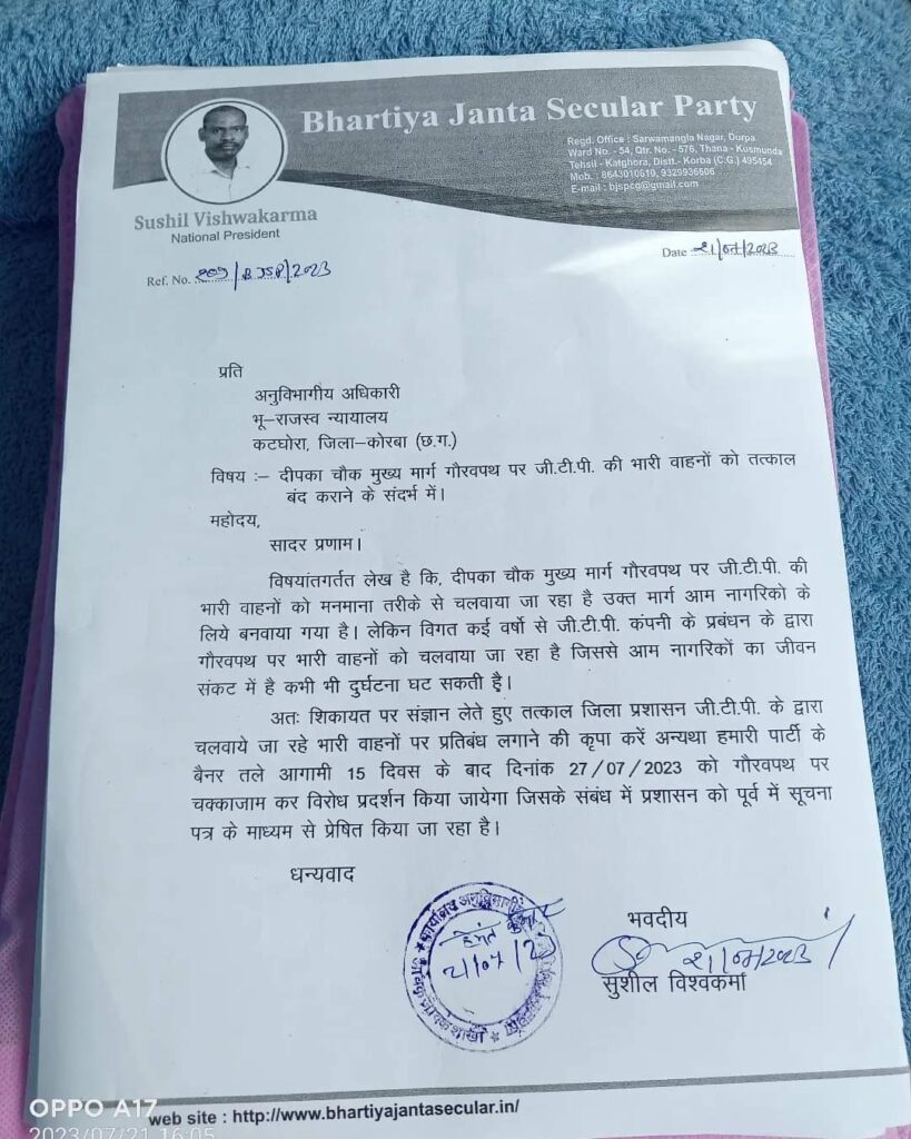 ,भारतीय जनता सेक्युलर पार्टी जिलाधीश कोरबा को 13जुलाई को लिखित शिकायत कर कहा कि 15 दिवस के भीतर नो एंट्री में भारी वाहन चलाने पर प्रतिबंधित किया जाए,नो एंट्री में भारी वाहनों पर 15 दिवस के भीतर प्रतिबंध नहीं किया जाता है तो इस स्थिति में 27 जुलाई को भारतीय जनता सेक्युलर पार्टी कोरबा इकाई के द्वारा वृहद चक्काजाम कर विरोध प्रदर्शन किया जाएगा
