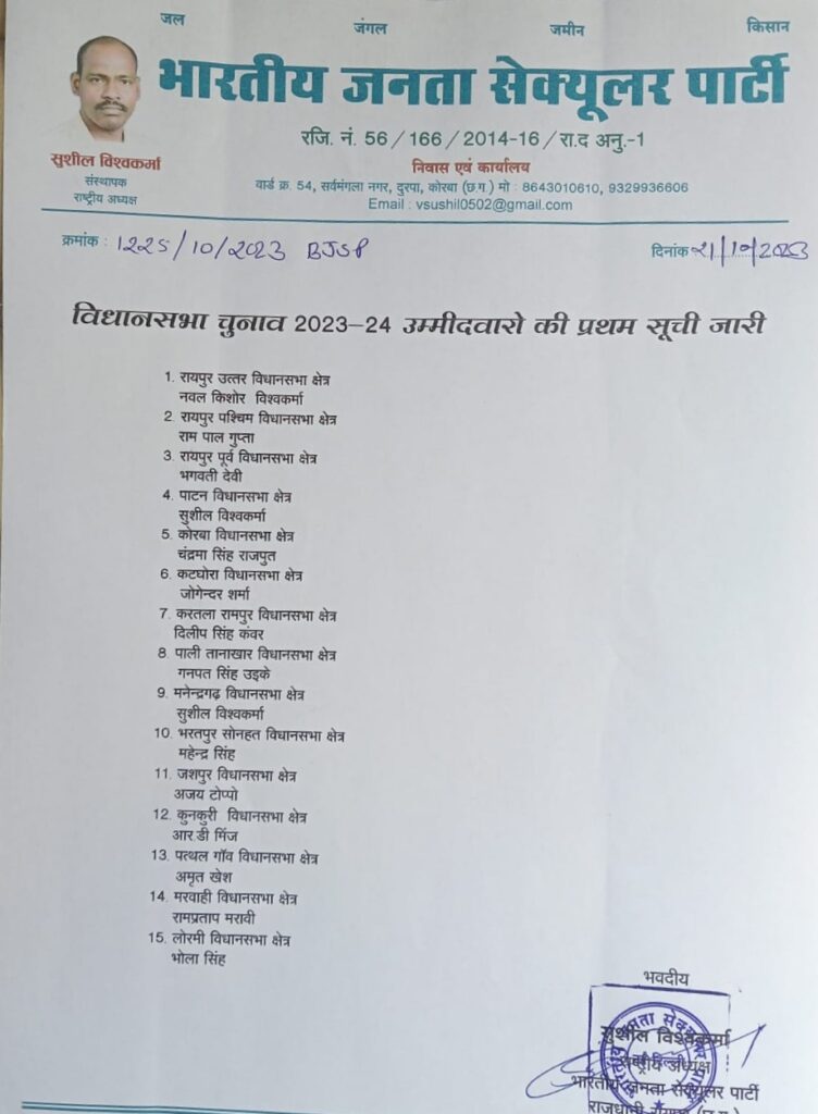 भारतीय जनता सेक्युलर पार्टी के राष्ट्रीय अध्यक्ष सुशील विश्वकर्मा ने कहा छत्तीसगढ़ विधानसभा चुनाव में हमारी पार्टी 15 सीटों पर अपनी प्रत्याशियों की पहली सूची जारी कर दिया है,शेष विधानसभा क्षेत्र के लिए प्रत्याशियों के संभावित नामों पर भारतीय जनता सेक्युलर पार्टी के चुनाव समिति शीघ्र ही अंतिम निर्णय लेकर घोषणा करेगी।