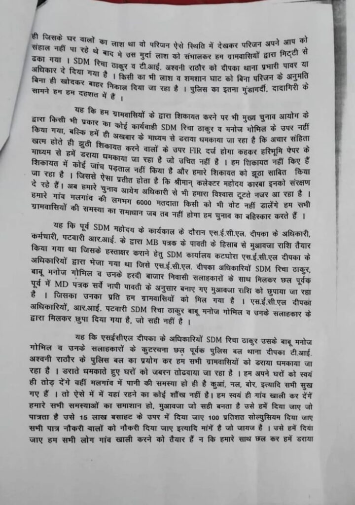 इस बात से आक्रोशित समस्त ग्रामवासी मल गांव के द्वारा निर्वाचन आयोग दिल्ली, निर्वाचन आयुक्त छत्तीसगढ़, जिलाधीश कोरबा व चुनाव आब्जर्वर सी के जमातिया को लिखित शिकायत करते हुए कहा गया कि शिकायत पर जांच कराकर संज्ञान लेते हुए वर्तमान मुआवजा पत्रक को निरस्त कर पूर्व अनुसार ही मुआवजा राशि प्रदाय किया जाए , यदि जायज मांगो पर भी किसी प्रकार से कोई संज्ञान नहीं लिए जाने की स्थिति में चुनाव का बहिष्कार करेंगे, व उच्च न्यायालय छत्तीसगढ़ की शरण लेंगे।