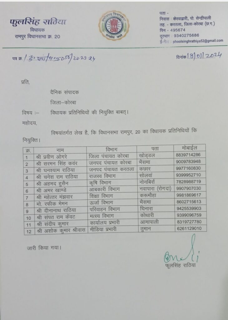 प्रखर राष्ट्रवाद न्यूज छत्तीसगढ़/कोरबा -छत्तीसगढ़ विधानसभा सदस्य विधायक फूल सिंह राठिया द्वारा विभिन्न विभागों में अपने प्रतिनिधियों की नियुक्ति कर दिया गया है। विधायक ने विभिन्न विभागों में नियुक्त सभी प्रतिनिधियों से कहा की रामपुर विधानसभा क्षेत्र के प्रत्येक क्षेत्र वासियों के अधिकारों की रक्षा,गरीबों की सेवा हमारी पहली प्राथमिकता है। जन जन की सेवा करते जनता की अपेक्षाओं पर खरा उतरना है।प्रत्येक प्रतिनिधियों से अपेक्षा व आशा है विभिन्न विभागों में जनमानस की समस्याओं व उनके समाधान पर वृहद स्तर पर कार्य करेंगे।रामपुर विधानसभा क्षेत्र विधायक फूल सिंह राठिया ने विभिन्न विभागों में नियुक्त किए गए नाम इस प्रकार हैं –