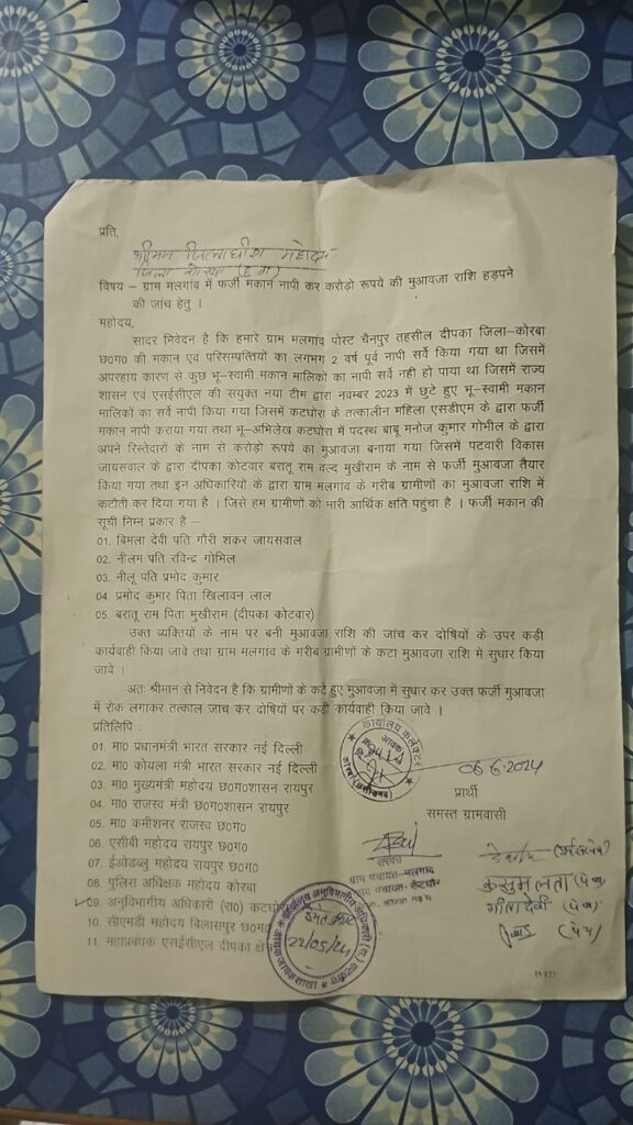 एसईसीएल दीपका के अधिग्रहित ग्राम मलगांव के ग्रामीणों ने सरपंच के नेतृत्व में सही व्यक्तियों को मुआवजा नहीं मिल पाने व अनुविभागीय कार्यालय कटघोरा में पदस्थ बाबू मनोज गोभिल द्वारा अपने स्वयं के परिवार सहित लगभग आधे दर्जन घनिष्ट लोगों के नाम से फर्जी मुआवजा राशि बनाए जाने को लेकर जिलाधीश कोरबा को लिखित शिकायत किया है,ग्रामीणों ने शिकायत करते हुए कहा है कि एसईसीएल दीपका के अधिग्रहित ग्राम मलगांव में मुआवजा राशि को लेकर कटघोरा के तत्कालीन अनुविभागीय अधिकारी द्वारा लगभग 2 वर्ष पूर्व मकान व परिसंपत्तियों नापी सर्वे किया गया था,कोई अपरिहार्य कारण से कुछ ग्रामीणों/भू- स्वामियों के मकान व परिसंपत्तियों का सर्वे नही हो पाया था जिसकी नापी सर्वे नवंबर 2023 में कटघोरा के तत्कालीन एसडीएम व एसईसीएल के संयुक्त टीम के द्वारा किया गया,ग्रामीणों ने अनुविभागीय कार्यालय भू अभिलेख शाखा में पदस्थ बाबू मनोज गोभिल सहित प्रशासनिक अमला पर भ्रष्टाचार का आरोप आगे हुए कहा कि फर्जी तरीके से नापी/सर्वे किया गया है।