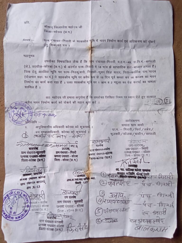 प्रखर राष्ट्रवाद न्यूज छत्तीसगढ़/कोरबा -: जिले में शासकीय भूमि का अवैध रूप से अतिक्रमण रुकने का नाम नहीं ले रहा है,प्रशासन अपने स्तर पर प्रयास कर रही है किंतु जिले में शासकीय भूमि पर अवैध रूप से अतिक्रमण करने वालों के हैसले दिन ब दिन बुलंद होते जा रहे हैं,रसूखदार अपने ऊंची राजनीतिक पंहुच का धौंस देकर प्रशासन के अधिकारियों को चुप करा देते हैं।ताजा मामला जिला मुख्यालय से करीब 40 किलोमीटर दूर बीहड़ आदिवासी क्षेत्र माना जाने वाला ग्राम गिरारी में पिछले कई दशक से साप्ताहिक बाजार लगता है,जहां बाजार के लिए शासकीय भूमि आवंटित किया गया है।पिछले दिनों एक मामला प्रकाश में तब आया कि लगभग 1 दर्जन ग्रामपंचायतों के सरपंचों ने जिला कलेक्टर से लिखित शिकायत करते हुए कहा कि रोजगार सहायक भुवन सिंह यादव द्वारा 16 कालम का भवन निर्माण किया जा रहा है।सरपंचों का कथन है चूंकि पंचायत का कर्मचारी होने के कारण रोजगार सहायक भुवन सिंह यादव को समझाइश किया गया की साप्ताहिक बाजार के शासकीय भूमि का अवैध रूप से अतिक्रमण न करे।किंतु बड़े पहुंच का हवाला देते हुए रोजगार सहायक भुवन सिंह यादव ने अवैध अतिक्रमण को हटाने से साफ इंकार कर दिया।गिरारी साप्ताहिक बाजार से प्रभावित लगभग 1 दर्जन ग्रामपंचायत के सरपंचों ने जिला कलेक्टर को लिखित शिकायत करते हुए रोजगार सहायक भुवन सिंह यादव के द्वारा किया गया अवैध अतिक्रमण को हटाने कि गुहार लगाते हुए कार्यवाही की मांग किया है।जिले में इन दिनों अवैध रूप से शासकीय भूमि पर कब्जा करने वालों की मानो बाढ़ सी आ गई है,प्रशासन भी खाना पूर्ति के लिए कई जगहों पर कार्यवाही करती है,और कार्यवाही करने का तमगा लिए फिरते हैं,किंतु एक तरफ जहां तहां देखा जाता रहा है की शासकीय भूमि पर अवैध रूप से कब्जा करने वाले बज नही आ रहे हैं,इस बात से अंदाजा लगाया जा सकता है की भूमि माफियाओं को प्रशासन की कार्यवाही की कोई खौफ नहीं है,प्रशासन का डीला रवैया ही है की भू माफियाओं का हौसला आसमान पर है।प्रशासन को लोगो को शिकायत पर ध्यान देते हुए अवैध रूप से शासकीय भूमि पर कब्जा करने वालों पर कार्रवाई करनी चाहिए।