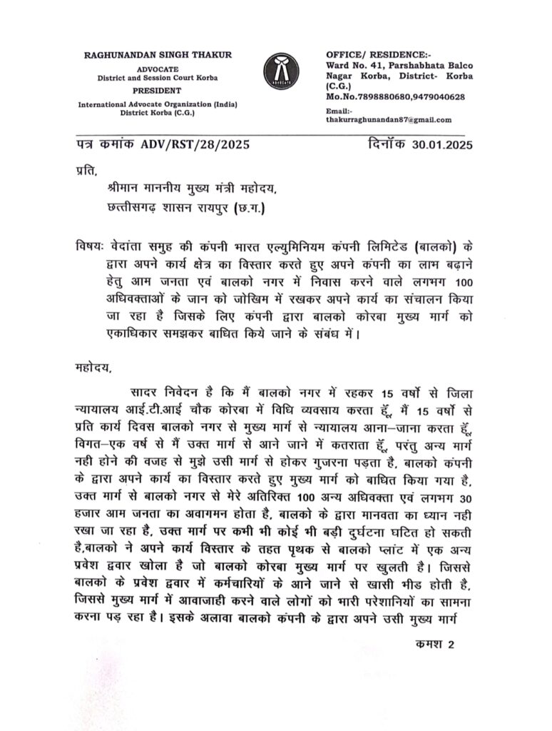 ततसंबंध में बालको में निवासरत अधिवक्ता रघुनंदन ठाकुर ने भी छत्तीसगढ़ के मुख्यमंत्री को पत्र लिखकर आग्रह करते हुए कहा है कि बालको कंपनी के कारण सड़क पर जाम और खतरे की आशंका सदैव बनी हुई रहती है,