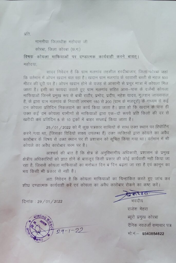 कि मल गांव सहित जिले में चल रहे अवैध कोयला के कारोबार पर शीघ्र लगाम लगाया जाए,एवम् अवैध कोयला तस्करों पर कठोर कार्रवाई किया जाए,जिस पर कोयला तस्करों का राष्ट्रवादी पत्रकार राजेश मेहरा से रंजिश रखना आम बात थी,