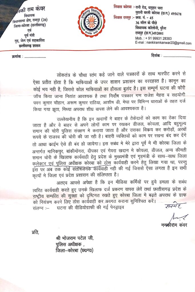 श्री कंवर ने कोरबा पुलिस कप्तान को कहा कि आपसे अपेक्षा है कि मीडिया कर्मियों पर हुए हमला के संबंध में त्वरित कार्रवाई करते हुए उनके खिलाफ दर्ज प्रकरण वापिस लेवें।